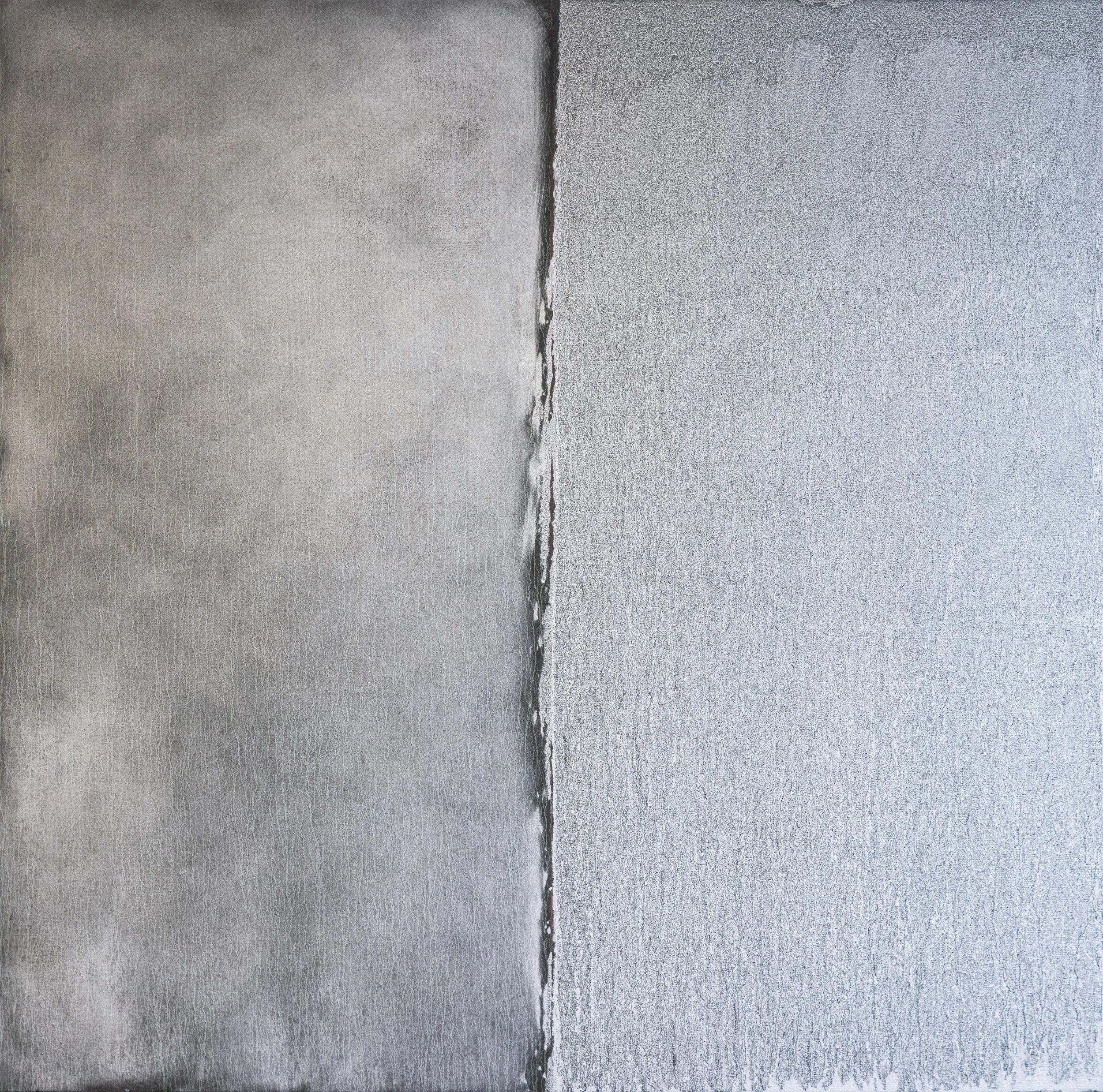 Looking to reinvent himself again, he decided to go “into the woodshed.” A phrase borrowed from jazz musicians, “woodshedding” means rehearsing alone. Working solo, he stripped down his color palate and by the 1980s, he had started drying out sheets of acrylic to create “tessellae”—fragmented pieces of hardened paint that he affixed to the surface of his canvasses to catch and reflect the light.