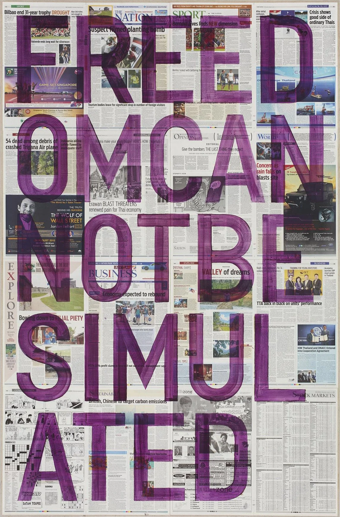 Mandy El-Sayegh’s process-driven practice investigates systems of order, be they linguistic, bodily, political, or other. She combines unexpected imagery using silkscreen, painting, and collage to create heavily layered canvases. El-Sayegh begins each piece with found fragments, such as clippings collected from newspapers, advertisements, and notebooks. She then, in her words, “sutures” these parts together on the canvas, superimposing disparate materials to construct new narratives. She often incorporates pages from the Financial Times, due to its subject matter and flesh-like color. In her ongoing “Net-grid” series, she paints grids over silkscreened layers that are meant to symbolize the limitations and confines of language.