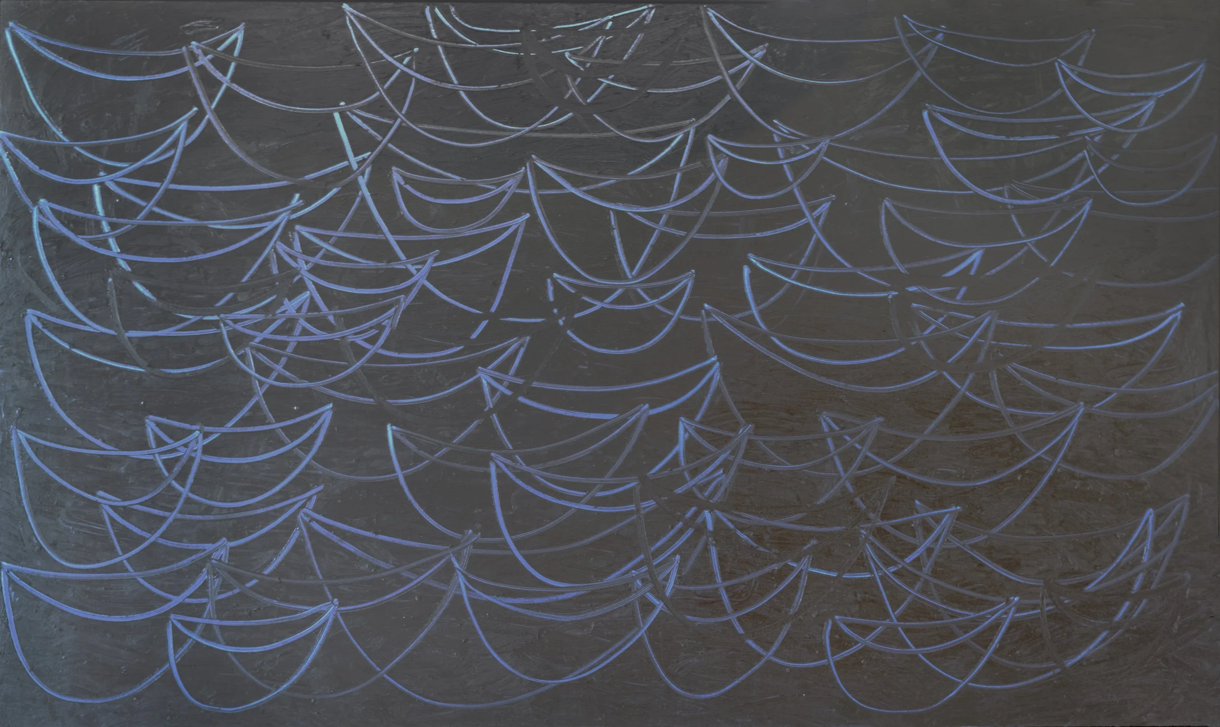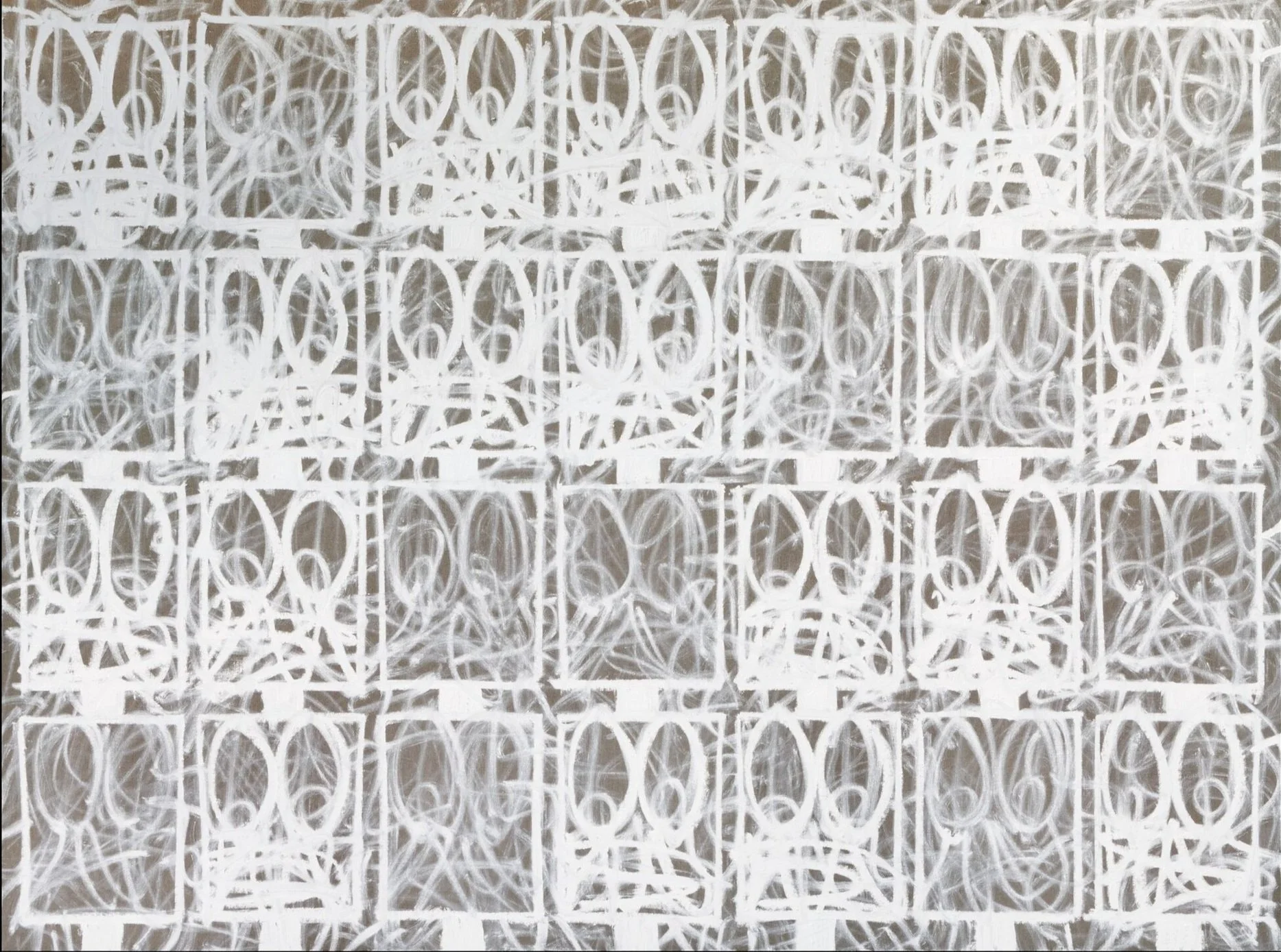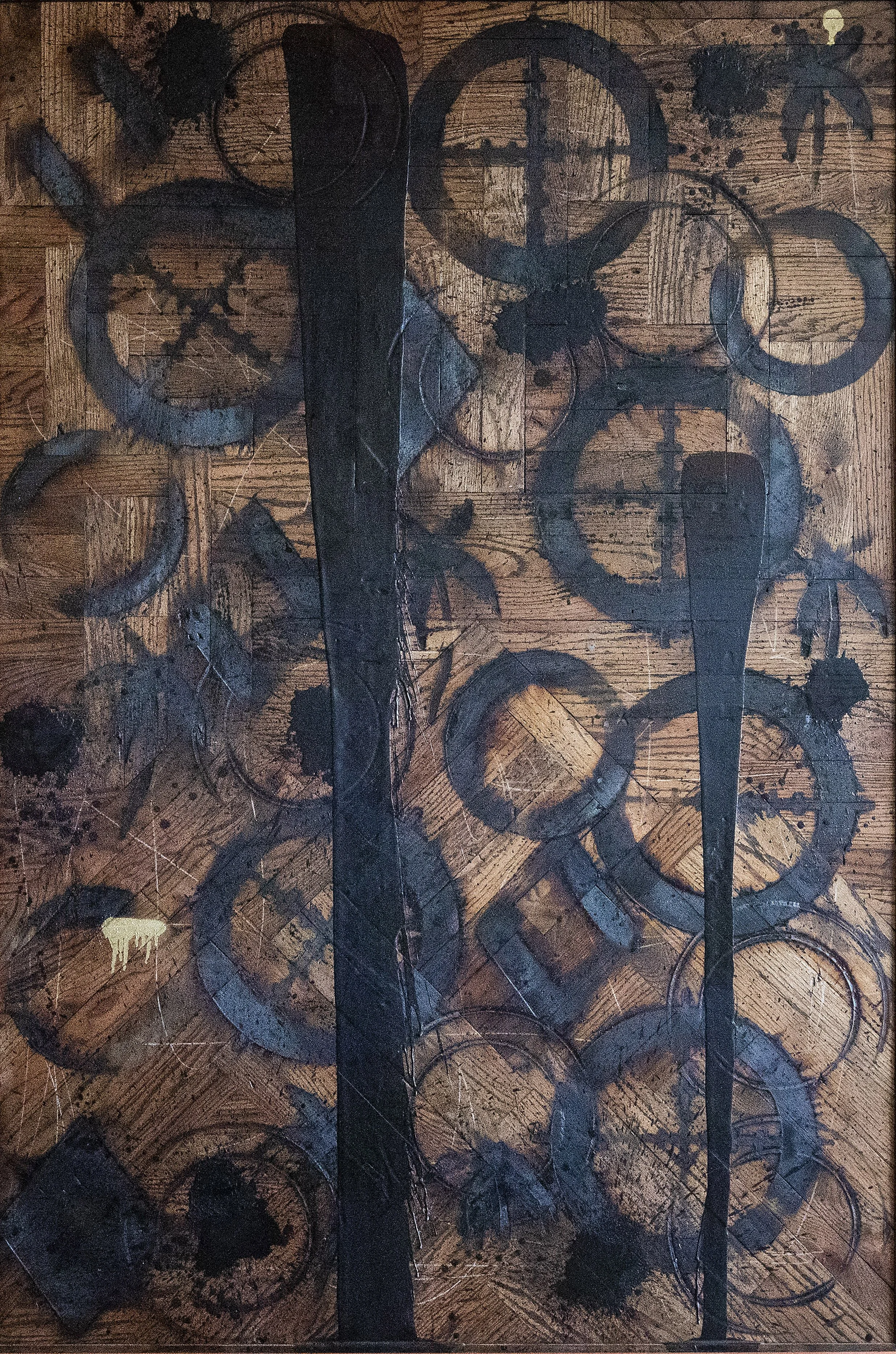 Vinyl, spray enamel, oil stick, black soap, and wax